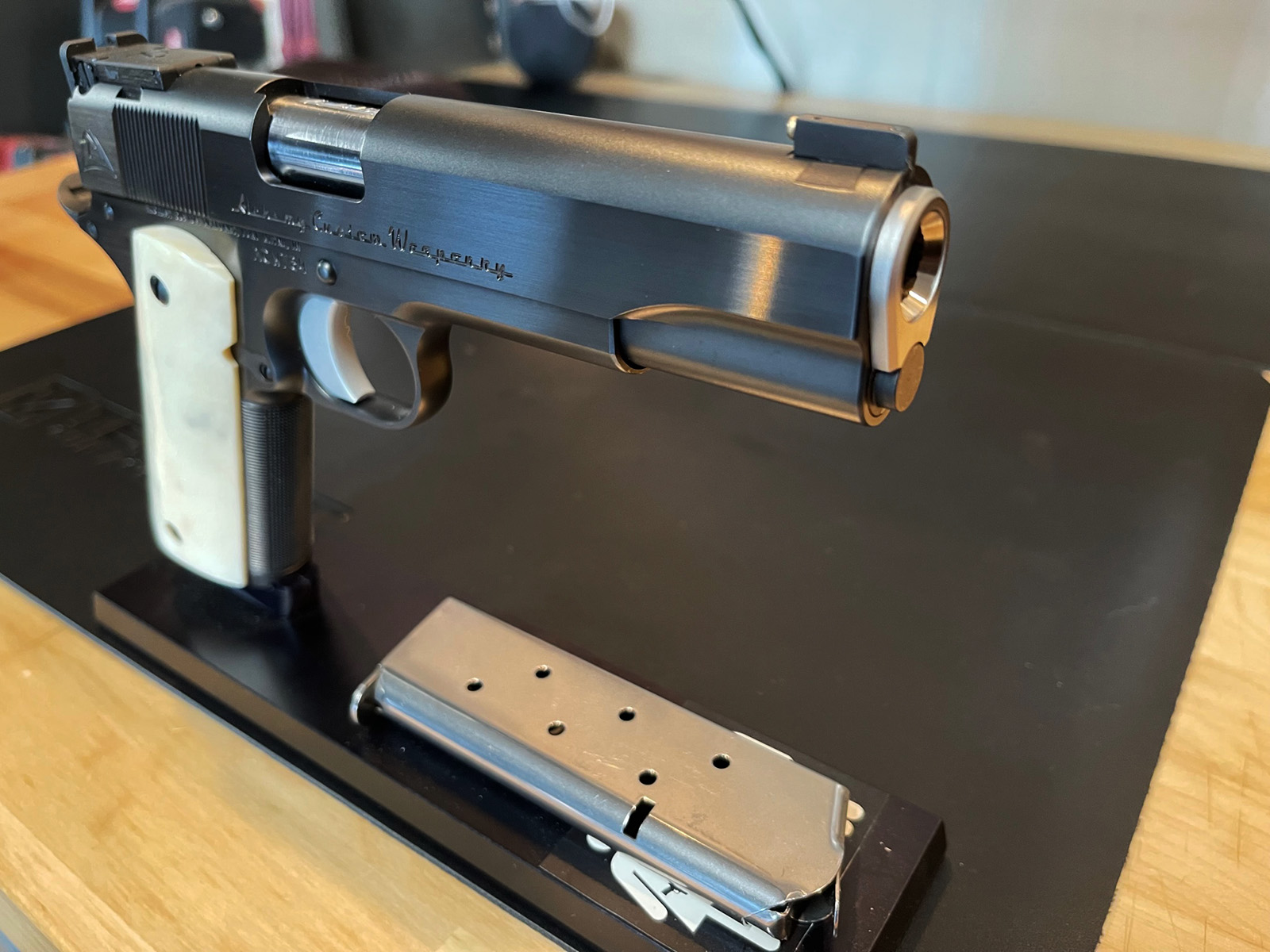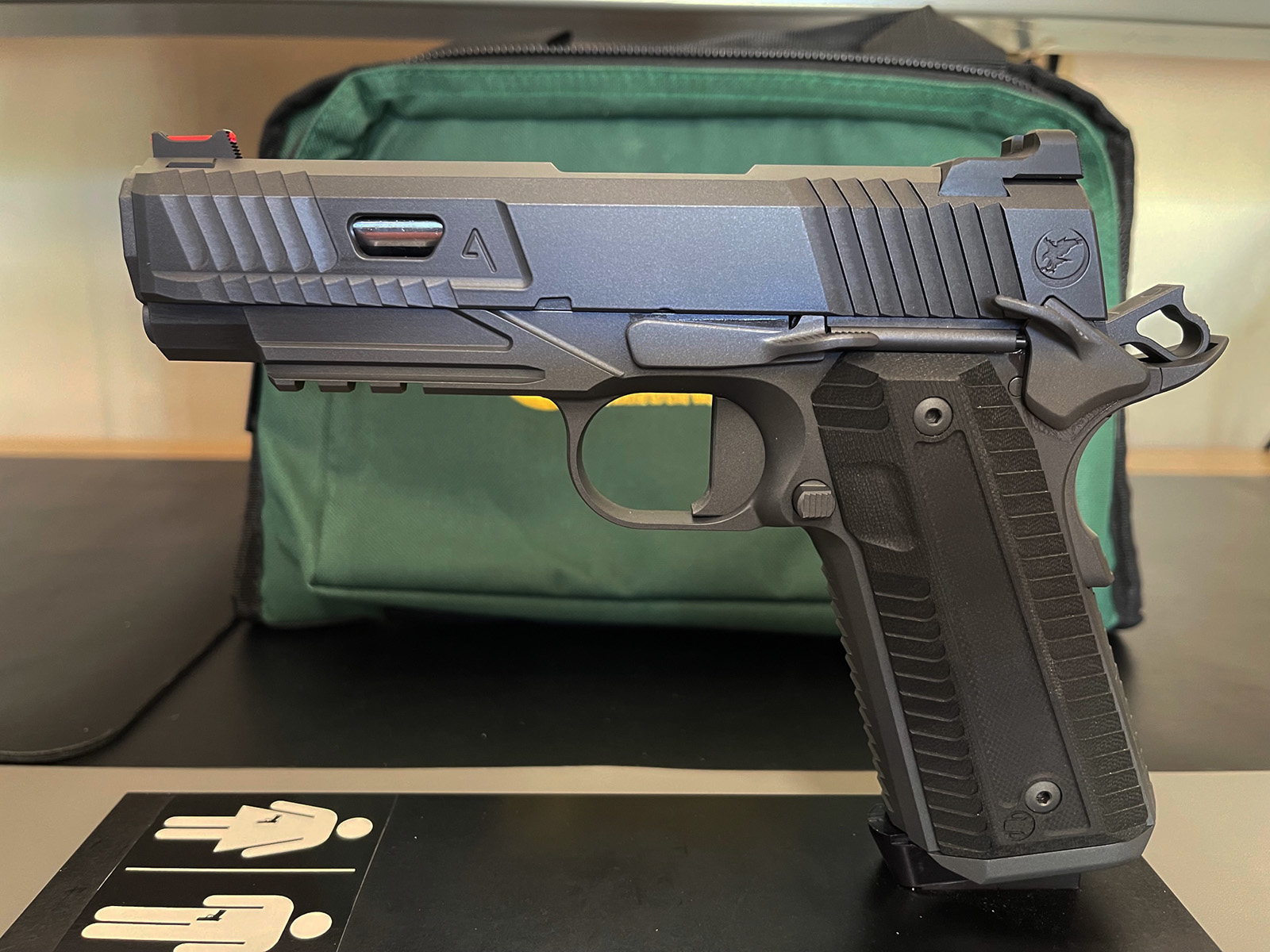 This one is a full-size 1911, also chambered for .45 ACP ammunition, called the Prime. It's made by a company called Alchemy Custom Weaponry: