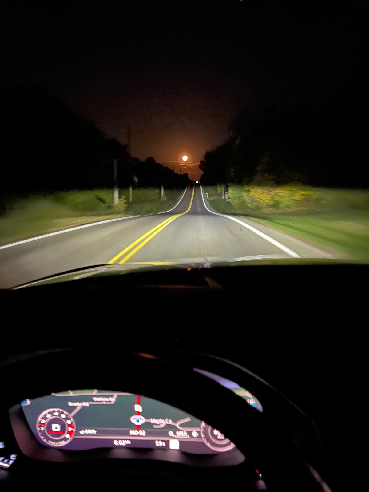 This is a picture I took driving to work one morning. The moon was out big and bright. The picture in no way does justice to how awesome it looked, but I think it's kind of interesting the way the iphone camera grabbed the shot as I was heading due west on 92 highway at about 60 miles per hour.