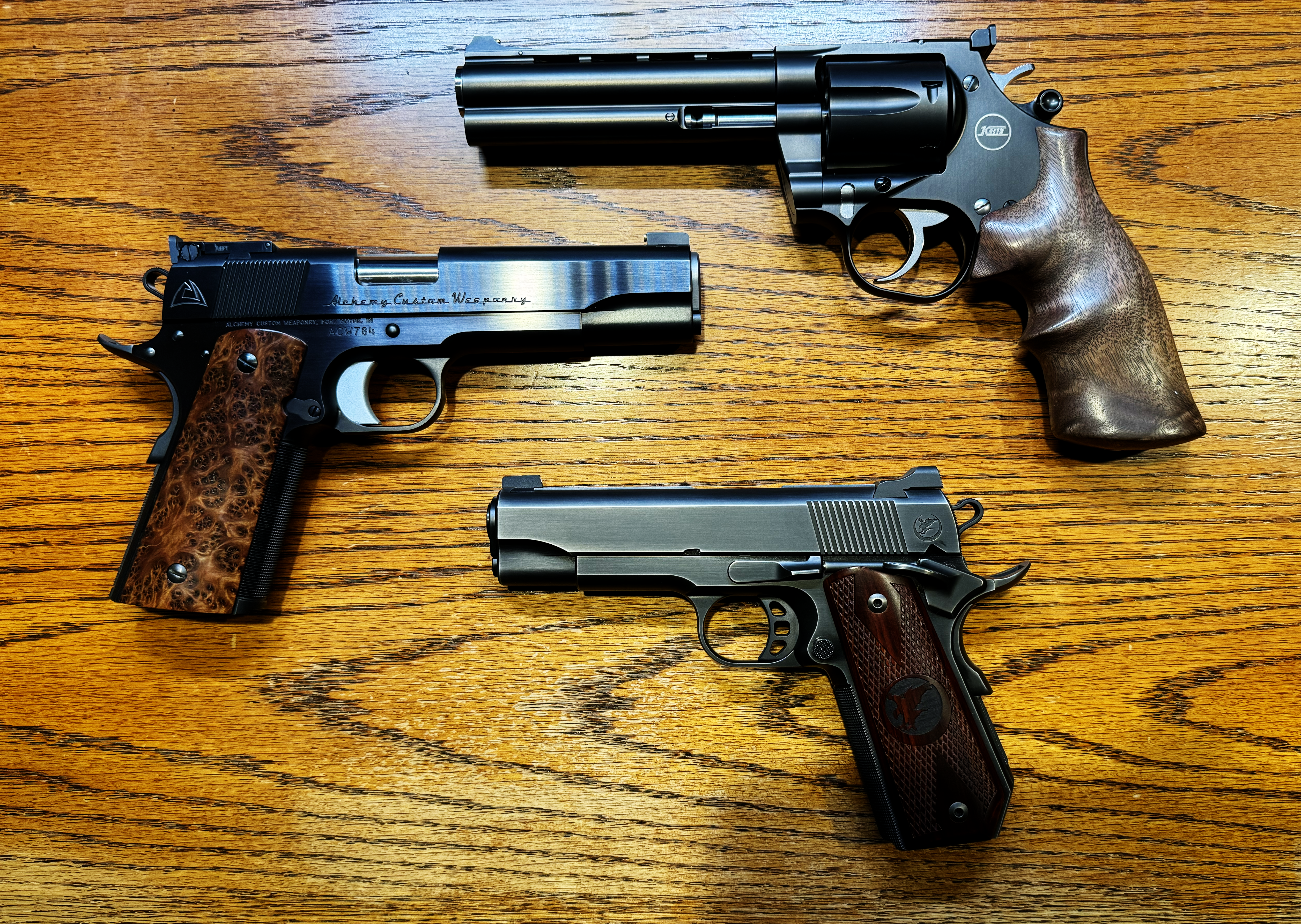 Made in Fort Wayne, Indiana, USA, by Rob Schauland -  an Alchemy Custom Weaponry Prime, government-size .45 ACP with thuya wood grips and a bomar-style rear sight.