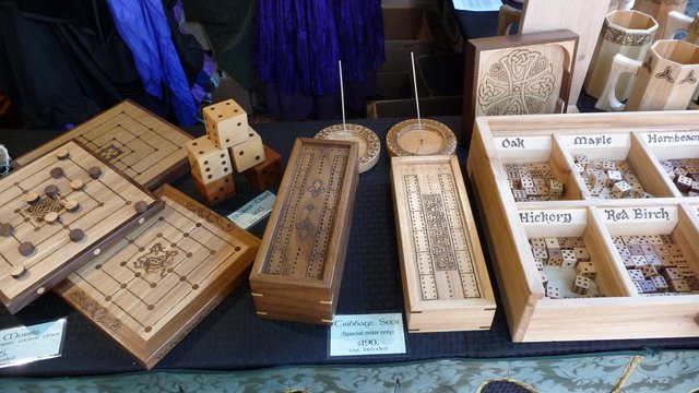 Here's a close up shot at one of the artist shops.  This guy makes things out of wood and then burns designs on them.  The top of those cribbage boards slide open revealing a compartment to keep decks of cards in.  I bought a wood clock for my game room.