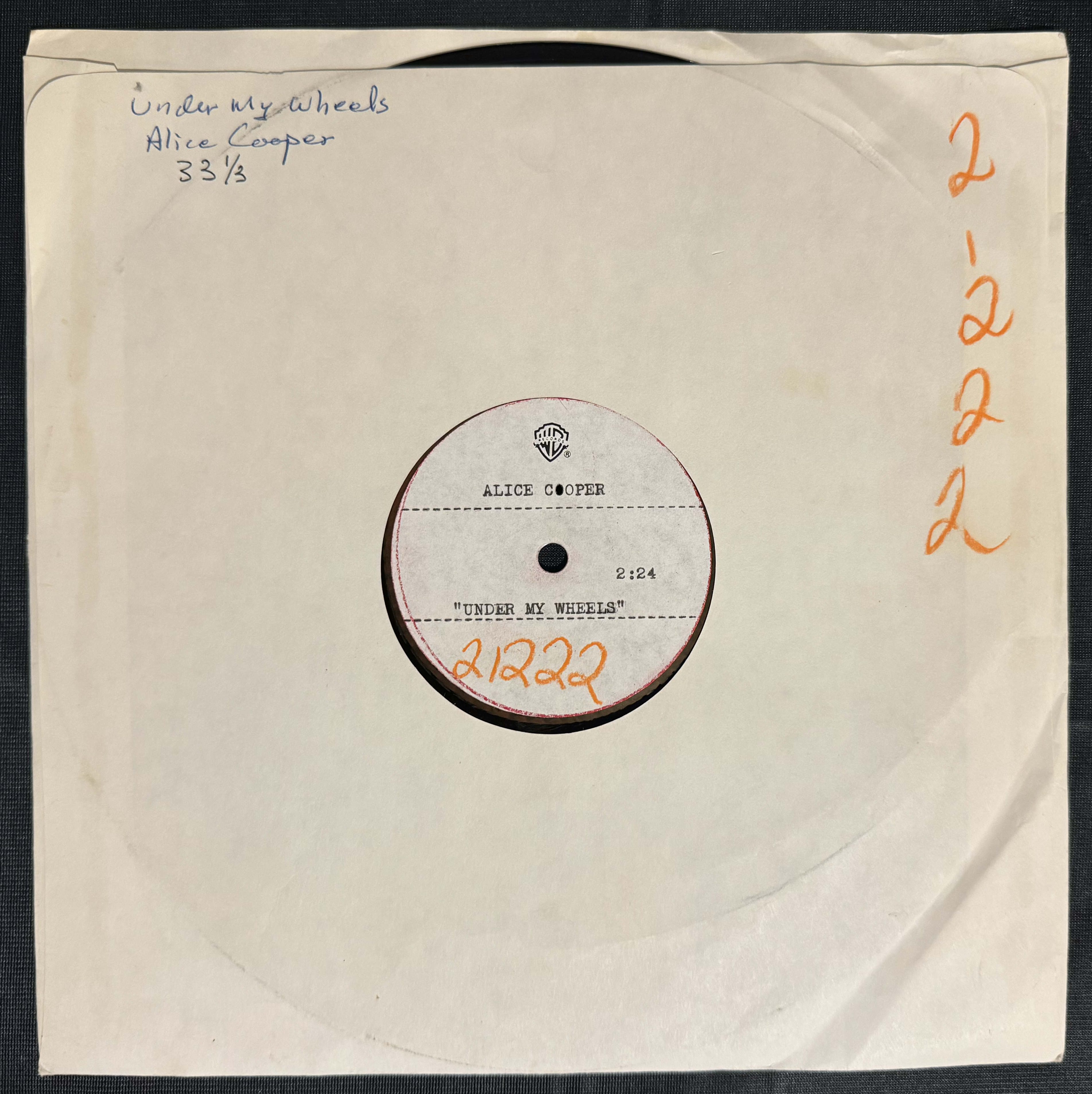 So, that's the back story. The front story is that I have a 10" acetate with Under My Wheels on it that plays at 33 and a third rpm, with a stated running time of 2:24. I played it once, recorded it, and timed it. Yep, 2:24. The run out of the song abruptly ends whereas the LP version (and presumably the 45 version) smoothly fades out. Additionally, the acetate I have is a different mix that the LP version. Or any version of that song I have ever heard. It has more reverb across the board, to the extent Cooper's voice sounds like he's singing in a tunnel, and the high frequencies are accentuated.