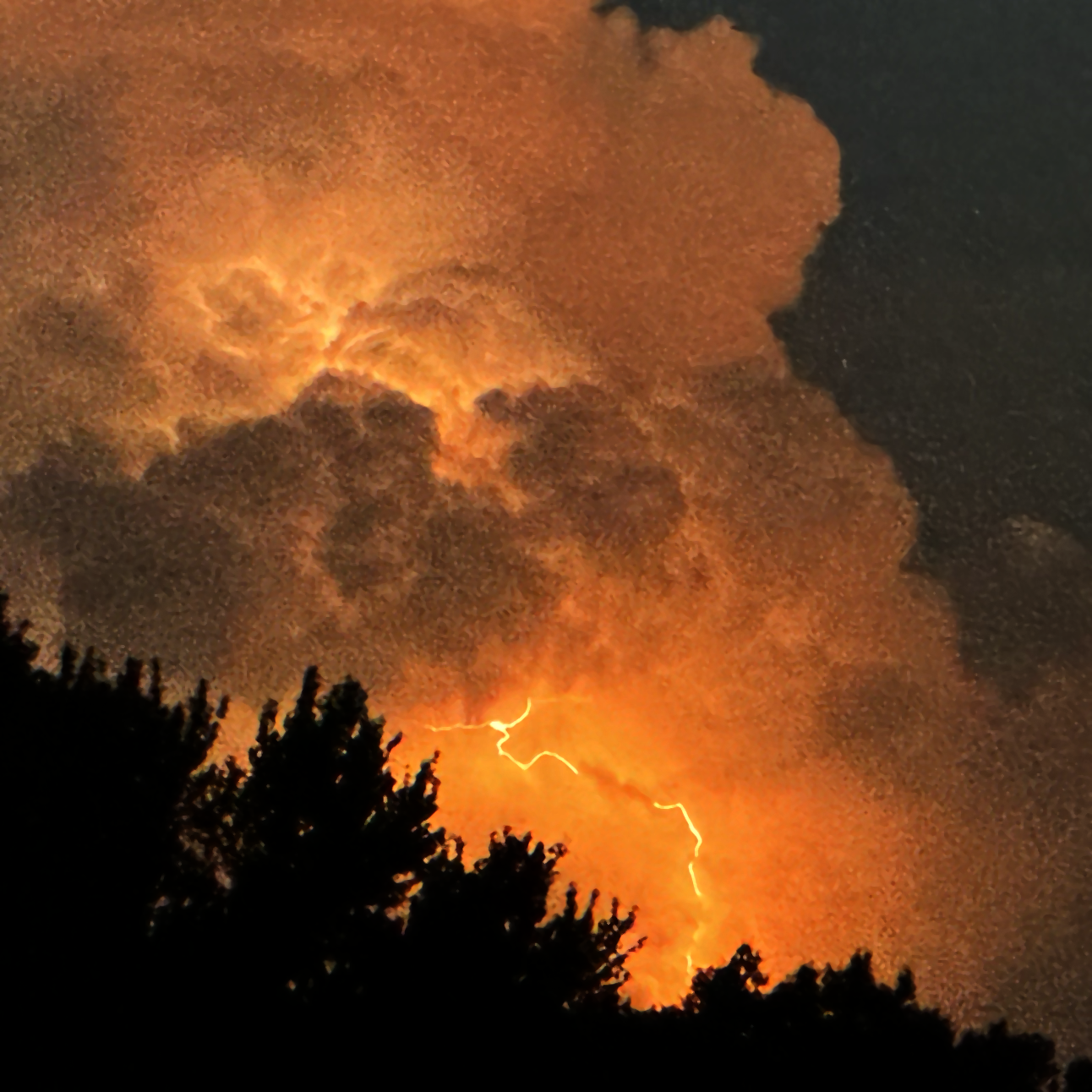 Scattered thunderstorms last night - went out back and there wasn't anything hitting my place, but down south was a cloud blowing up with lightning. I happened to have my phone on me so I took about fifty pictures in rapid succession and managed to capture one. It looks like it's fire setting off an explosion.