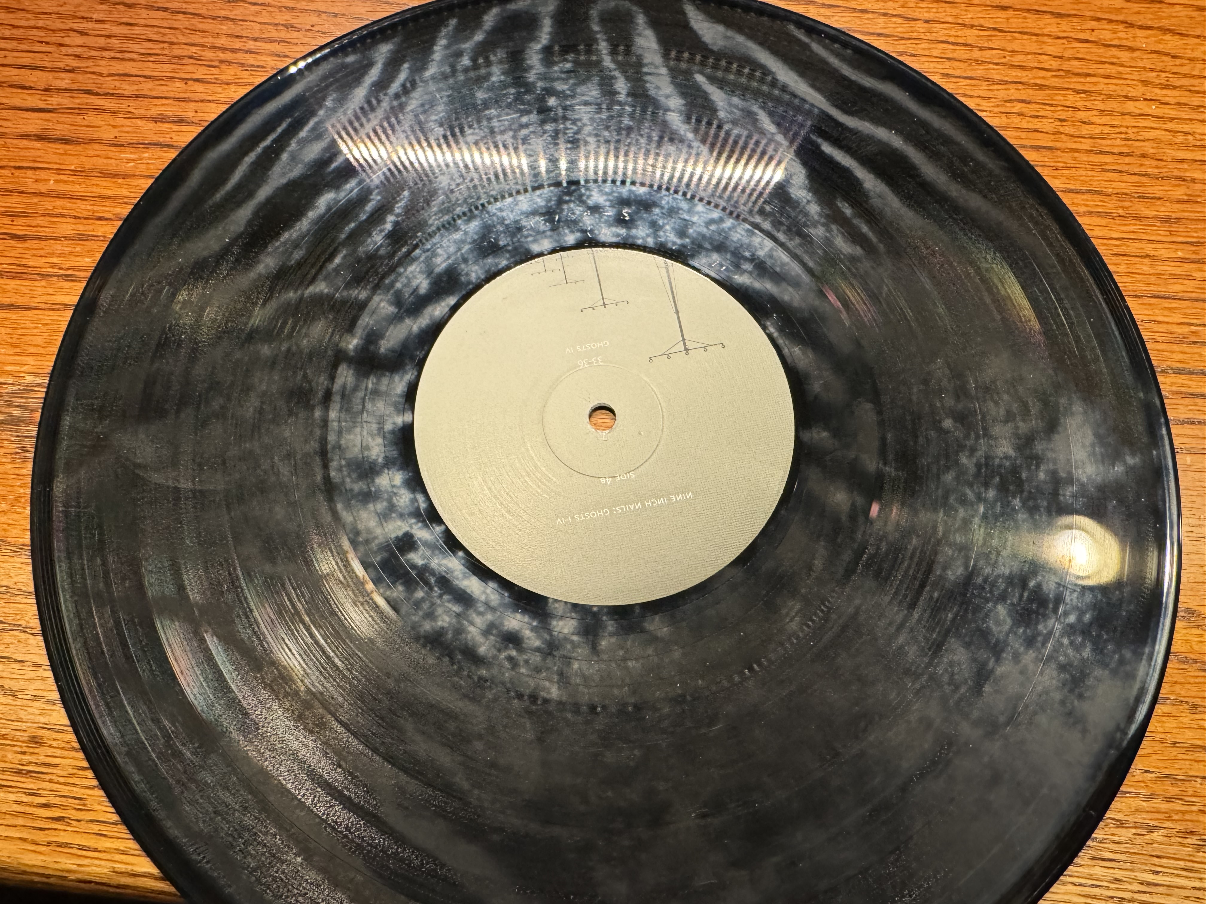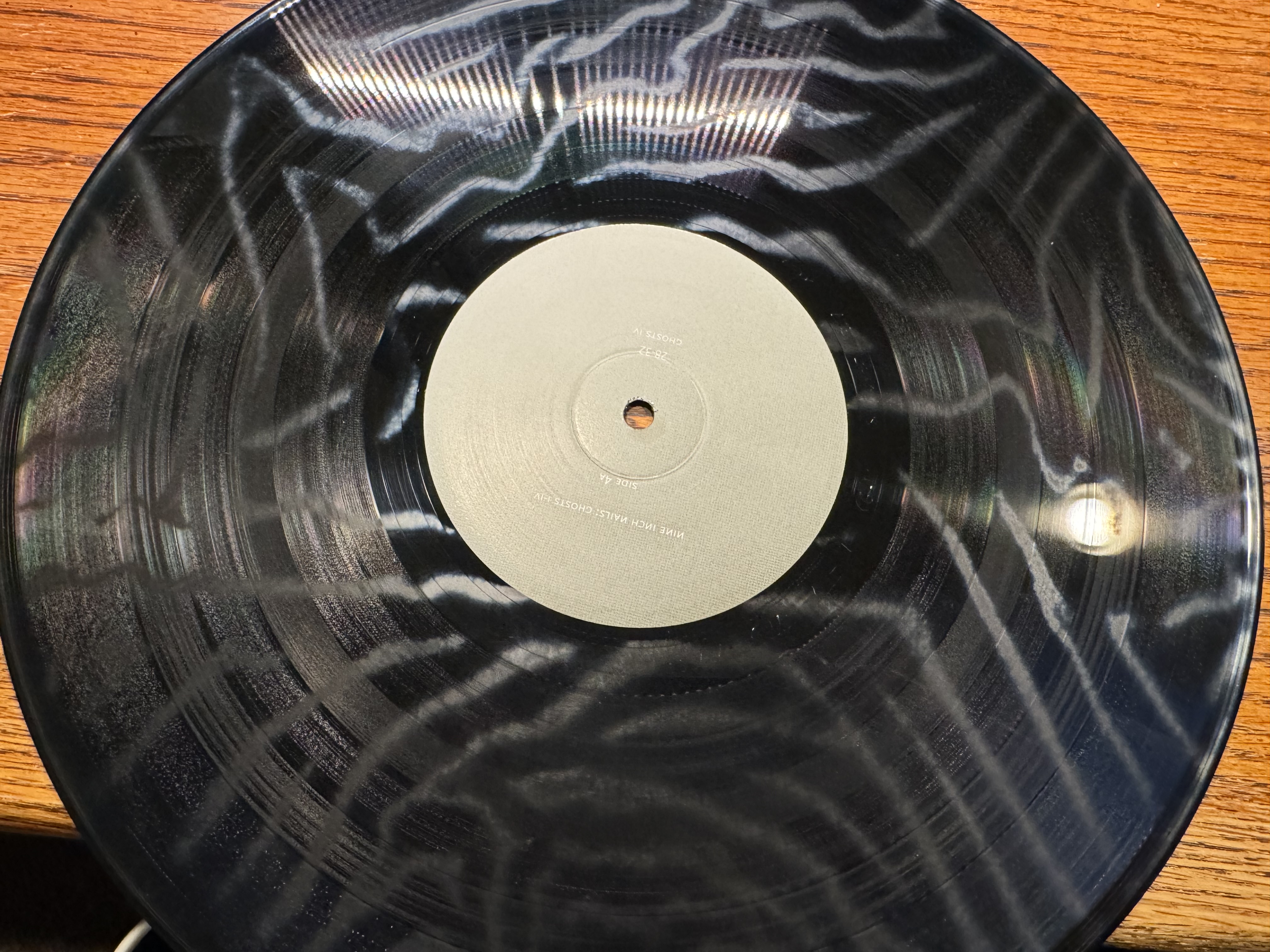 Opened the box, and was hit with the smell of...PVC reacting with vinyl. Pulled out all four disks (these have never been out of their sleeves since I bought it new back in the day, always played the CD)...here's side A and B of one of them. They all look the same...really glad I don't much give a shit about NiN...I didn't want to subject my record player with this crap, so I figured I'd listen to either Billy Joel's "The Stranger," or Steely Dan's, "Katy Lied". Both known for poor sound, for different reasons :) Went with SD.