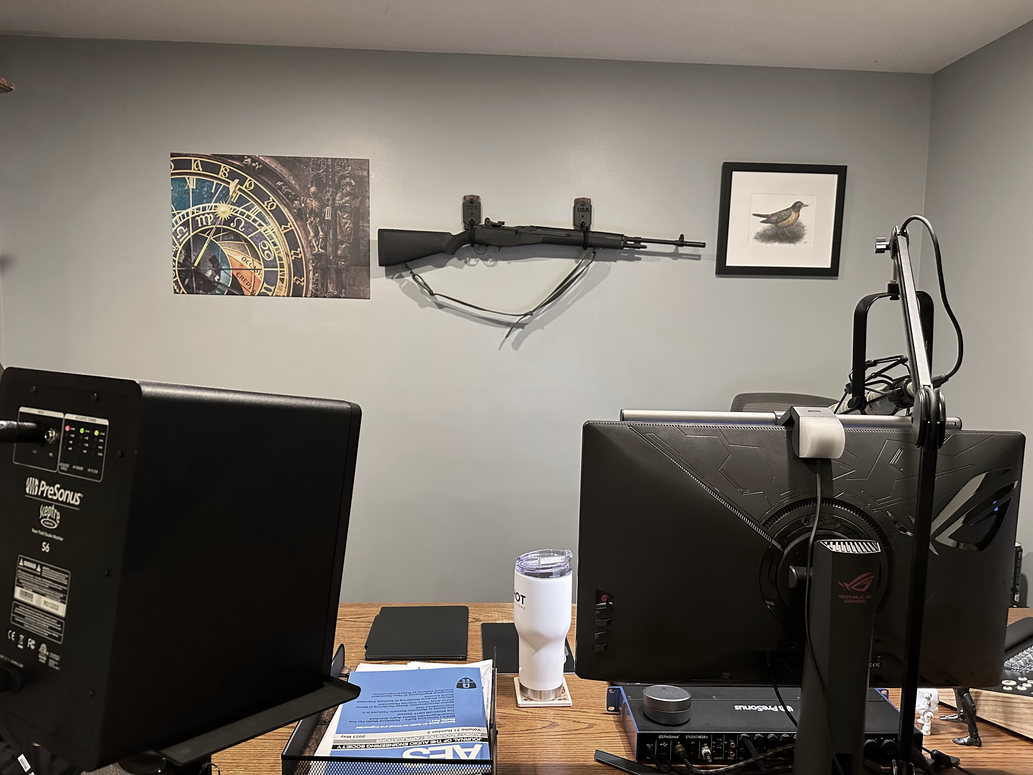 Finally got around to putting some wall hooks up to hang my M1A. No magazine in it, but I have five, each holds 20 rounds of 7.62 x 51 mm NATO ammunition (that'd be .308 Winchester for all of us rednecks in the world). Oh, just as an aside, whenever you read about how powerful a 5.56 (AR-15 ammo) is, the ammo this thing shoots is twice as powerful - or more, depending on the load:
